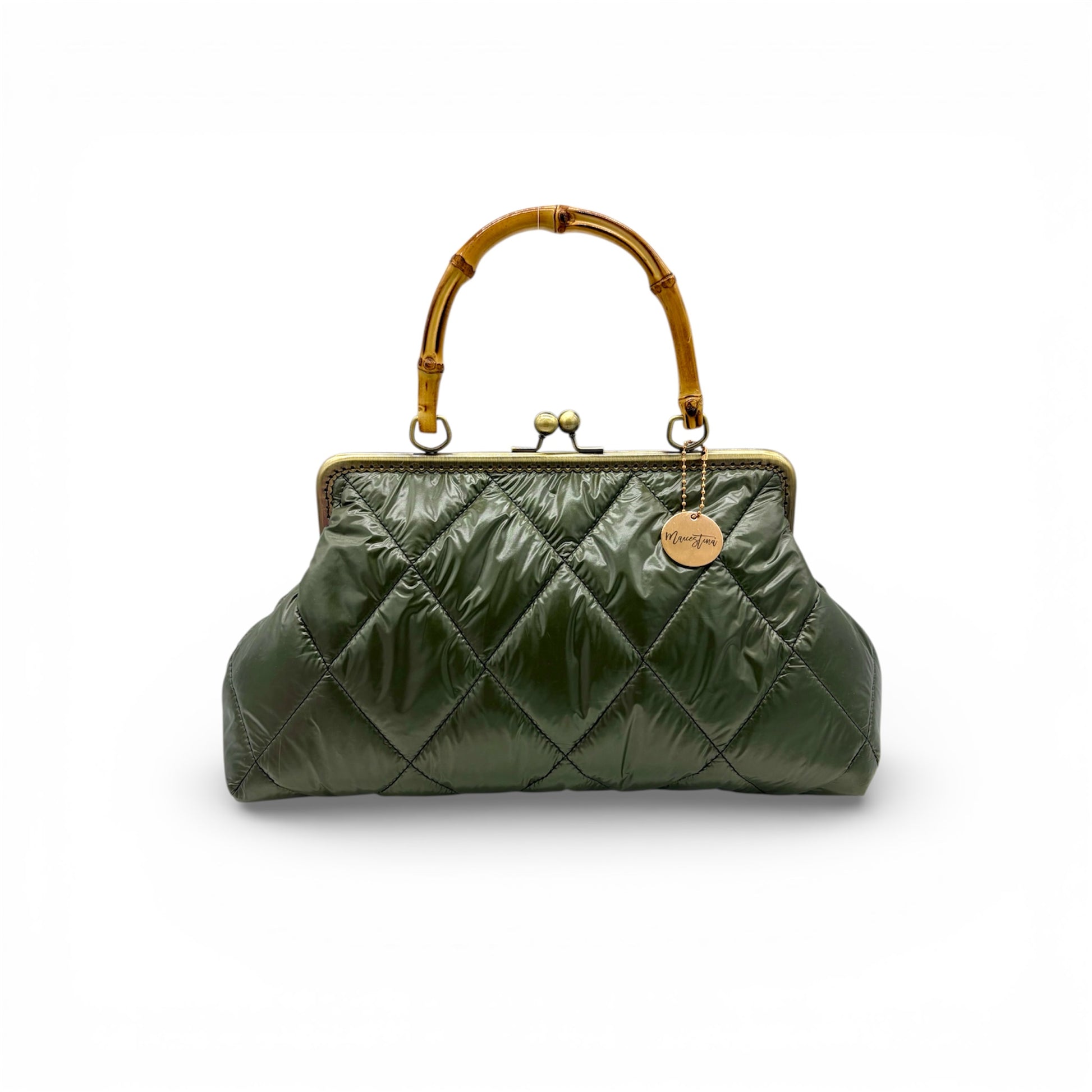 Lylou - Moss clic clac dal fascino retrò, reinterpretata in chiave contemporanea, morbida ma strutturata si apre con la classica chiusura a scatto. Realizzata in tessuto tecnico trapuntato, manico in bamboo.